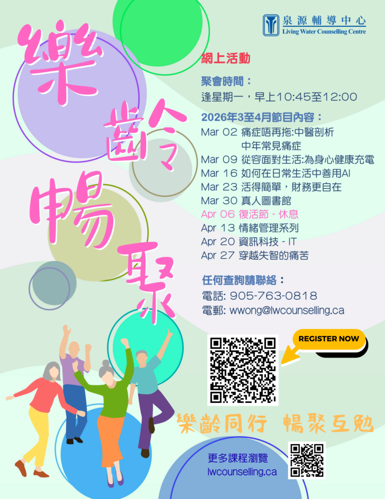 「樂齡暢聚」是一個專為長者而設的網上活動。透過每周定期的ZOOM上活動,豐富長者社交的互動,減少孤獨感;而提供不同範疇的專業講座,包括精神健康、中醫保健、防網錦囊、旅遊風情、運動與飲食,更增強與自己、他人及社會的聯系。而義工組長及組員間的關懷,更能提升長者的幸福感,歡迎長者參加。